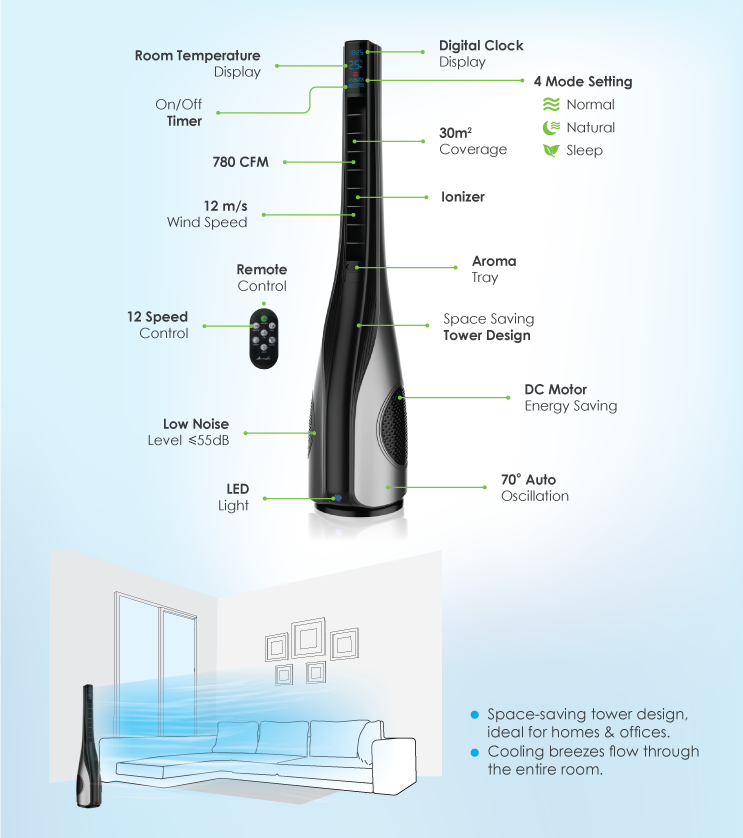 It blows out air at a 90 degree angle which when combined with the height of the fan contributes to a wider coverage area in circulating the cool air. A tower fan also enjoys an advantage over normal electric fans as it takes minimum space. It also is a design culture for the general people.